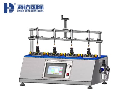 將樣品固定于本機(jī)夾具上(帶電測(cè)試樣品需要鎖緊快速插頭),扭緊夾具螺桿使樣品固定。不銹鋼迷你氣缸則在調(diào)好適當(dāng)高度情況下,上下往復(fù)點(diǎn)動(dòng)按鈕,直到樣品損壞,記錄點(diǎn)動(dòng)次數(shù)。