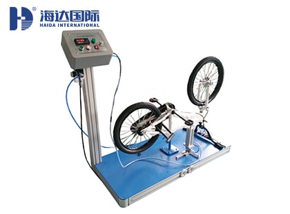 海達(dá)儀器HD-S518自行車驅(qū)動(dòng)系統(tǒng)靜負(fù)荷試驗(yàn)機(jī),主要測(cè)試自行車驅(qū)動(dòng)系統(tǒng)的靜態(tài)強(qiáng)度,取左曲柄處于向前、水平位置,在左腳蹬的中心垂直向下施加一力F,逐漸達(dá)到1500N,保持1min(GB為15S)。 萬(wàn)一在負(fù)荷的作用下,由于系統(tǒng)屈服或驅(qū)動(dòng)鏈輪張緊而使曲柄轉(zhuǎn)過水平面以下30°位置時(shí),將曲柄重新回到水平位置,或者考慮到系統(tǒng)的屈服,而將曲柄置于水平面以上某個(gè)位置,再重復(fù)試驗(yàn);在完成左曲柄的試驗(yàn)之后,應(yīng)將右曲柄取向前水平位置,并將力施加在右腳蹬上,重復(fù)該試驗(yàn)。